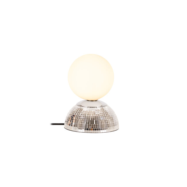 Looking for an eye-catching table lamp that instantly adds atmosphere to your interior? GLITZER stands out thanks to its unique disco ball–shaped base. The mirrored faceted structure playfully reflects light throughout the room and gives the lamp a glamorous look. The opal white glass globe spreads a soft and pleasant light, perfect for a bedside table, dresser or side table. The switch on the cable ensures easy operation. Suitable for a G9 LED light source (max. 5W, not included). With a diameter of 14 cm and a height of 18.4 cm, this modern table lamp fits effortlessly into various interiors.